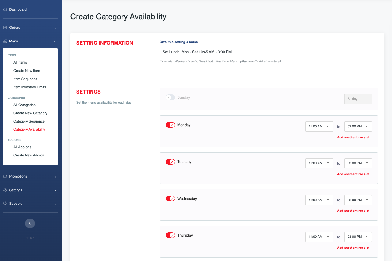 18:00to22:00.Note: If the category should be available all day, set it ‘All day’.