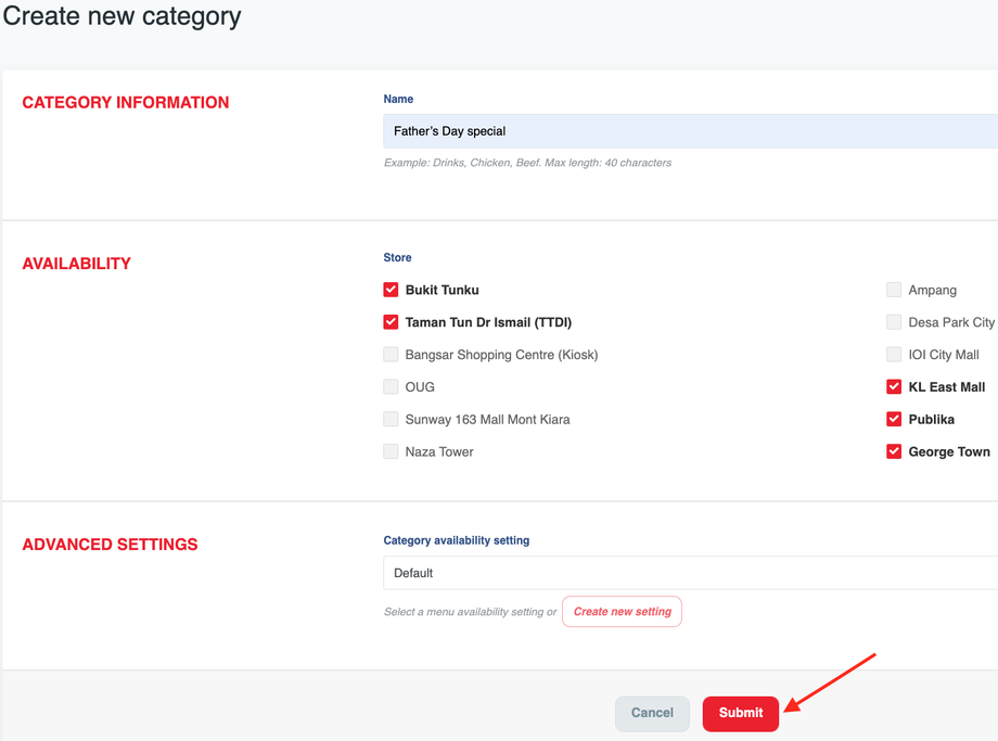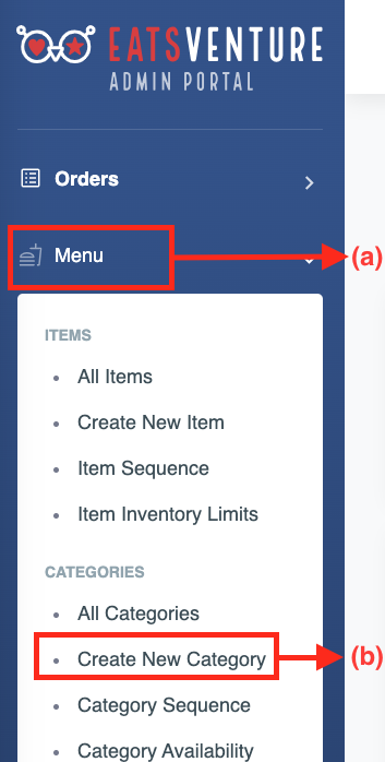 a) Tap on (a)'Menu' option and select (b)'Create new category'.b) Fill in all category details and tap the 'Submit' button to create a new category.