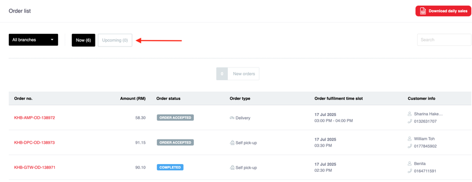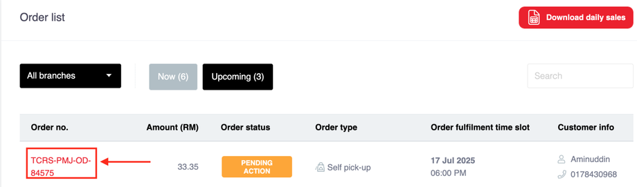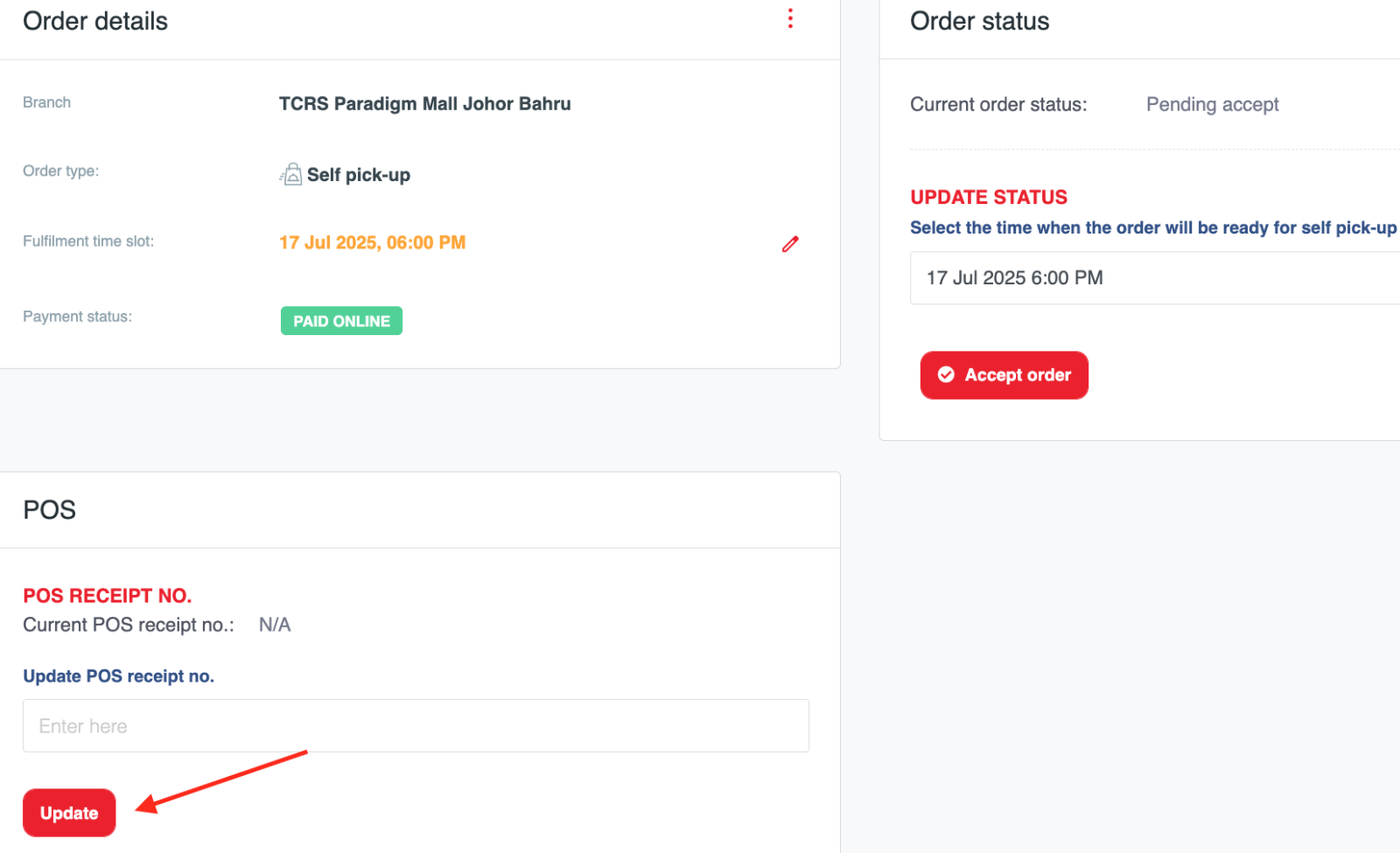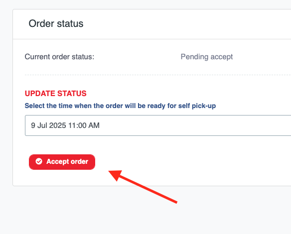 For self-pick up orders, the order status ready for pick-up should be updated once the order is completed by Clicking the Accept order button (this step is important to keep customers informed).