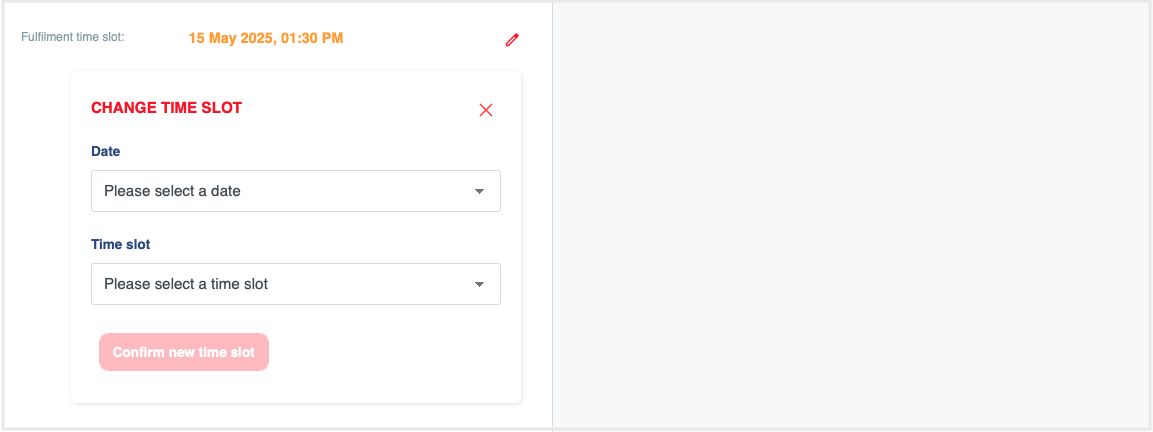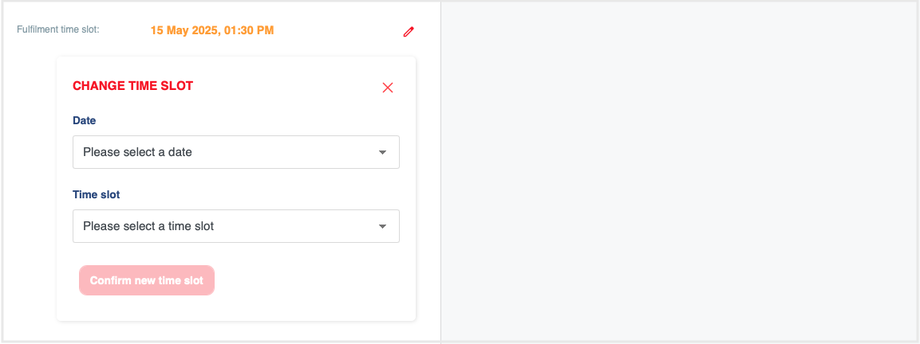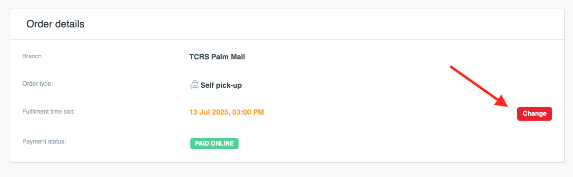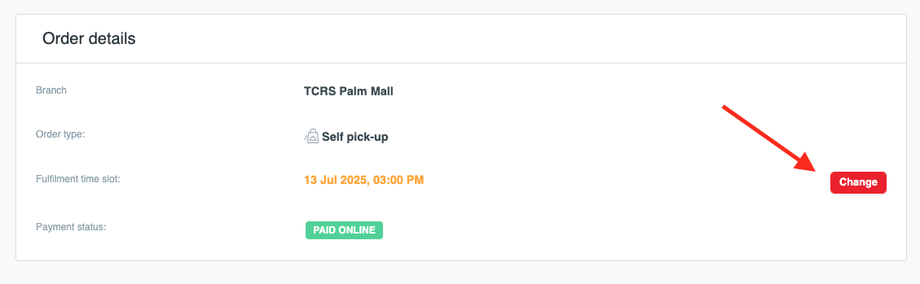 Initiate Change: On the Order Details page, tap the 'Change' button next to the Fulfillment time slot.