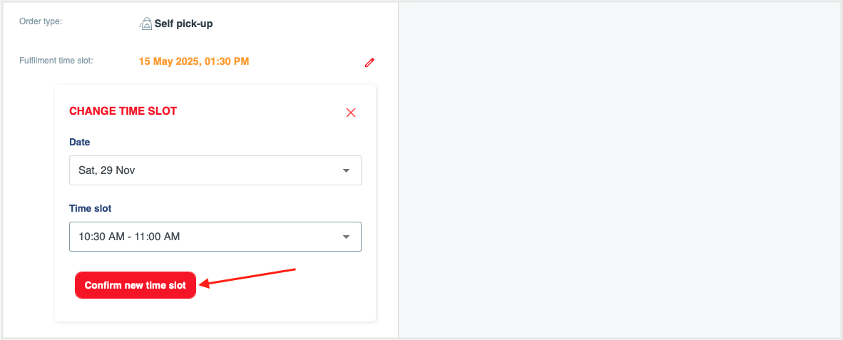 Update Time: In the 'CHANGE TIME SLOT' dialog, select the new Date and Time slot.
