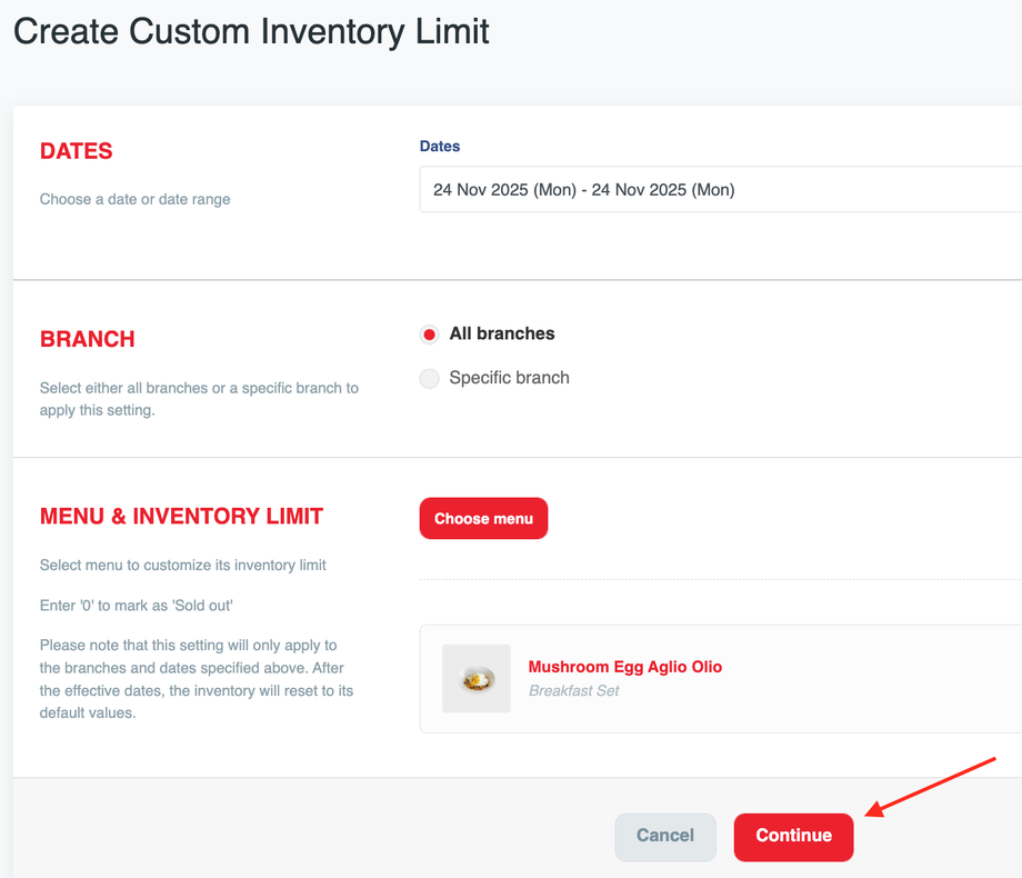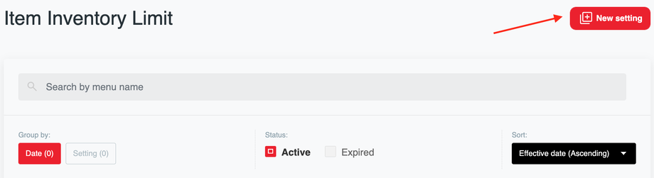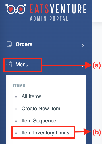 a) Tap on (a)'Menu' option in admin portal and tap (b)'Item inventory limits'.b) Click on ‘New setting’.c) Fill in all the details and tap on ‘Continue’ to proceed.