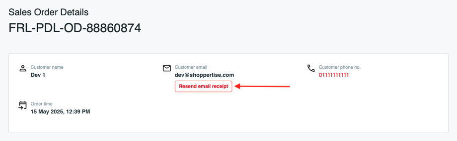 Initiate Resend: On the Sales Order Detail page (Image below), tap on 'Resend email receipt' below the Customer email.